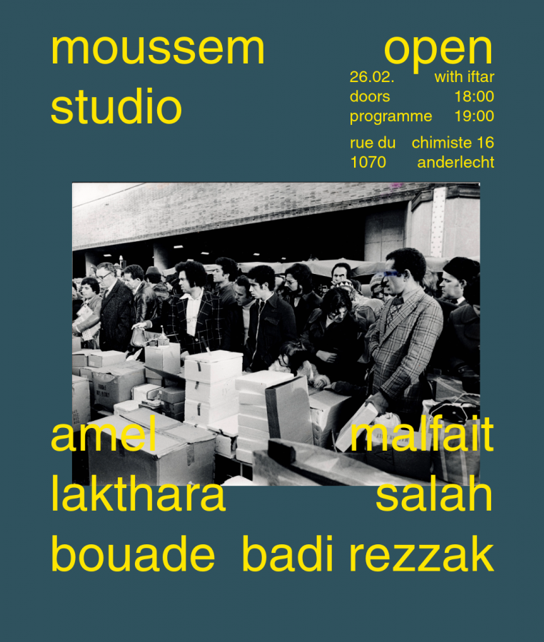 Amel Malfait Lakhtara, Salah Bouade and Badi Rezzak: three artists, two open studio’s, one mobile sculpture presentation, preceded by an iftar. Join us on the 26th of February at the Moussem Studios in Espace Chimiste for breaking the fast at 18:20 and a triple artistic programme at 19:00!